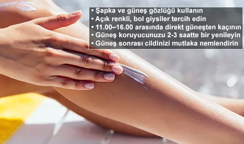 Yazlık cilt koruması yalnızca güneş kremi sürmekle sınırlı değildir. Şapka takmak, gözlük kullanmak, bol ve açık renkli giysiler tercih etmek de cildin korunmasına destek olur. Özellikle 11:00–16:00 saatleri arasında direkt güneş ışığına maruz kalmamaya özen gösterin.